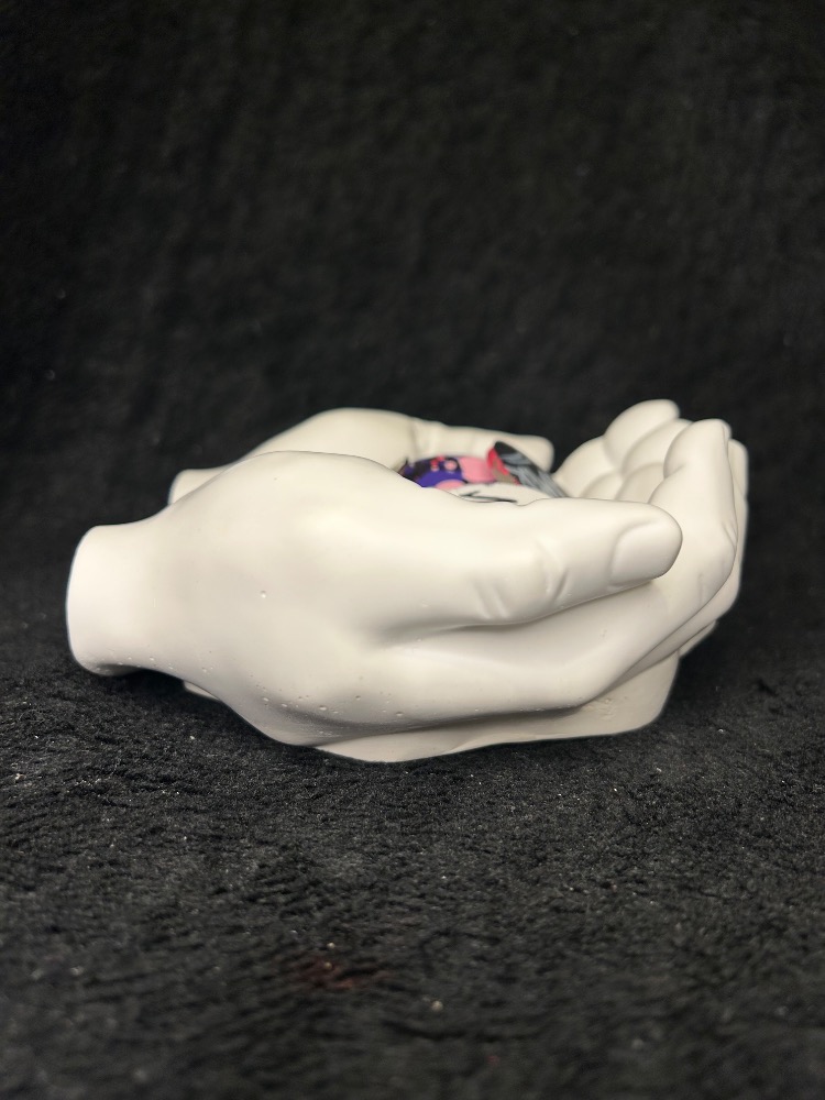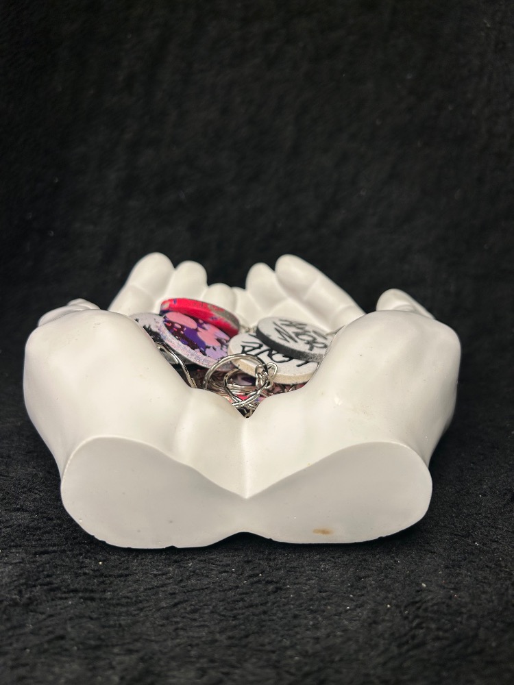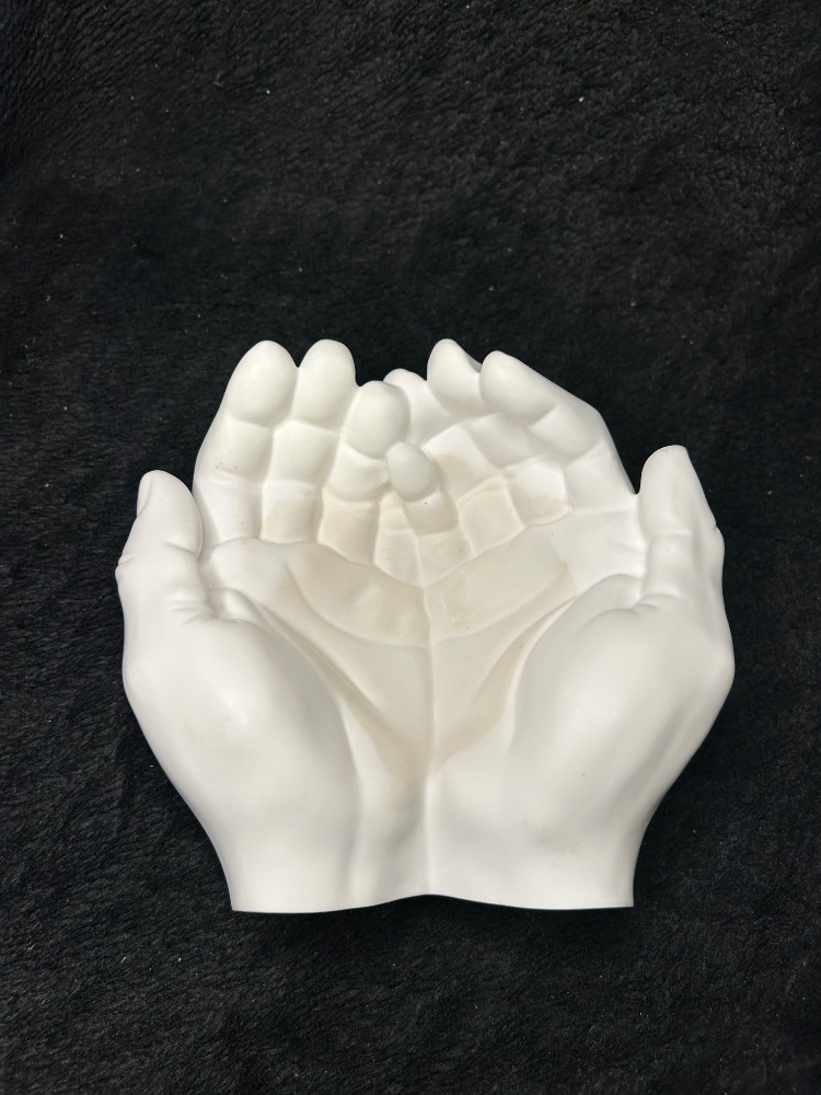Sádrové ruce ve tvaru misky na odkládání drobných předmětů, mincí, šperků, klíčů atd.